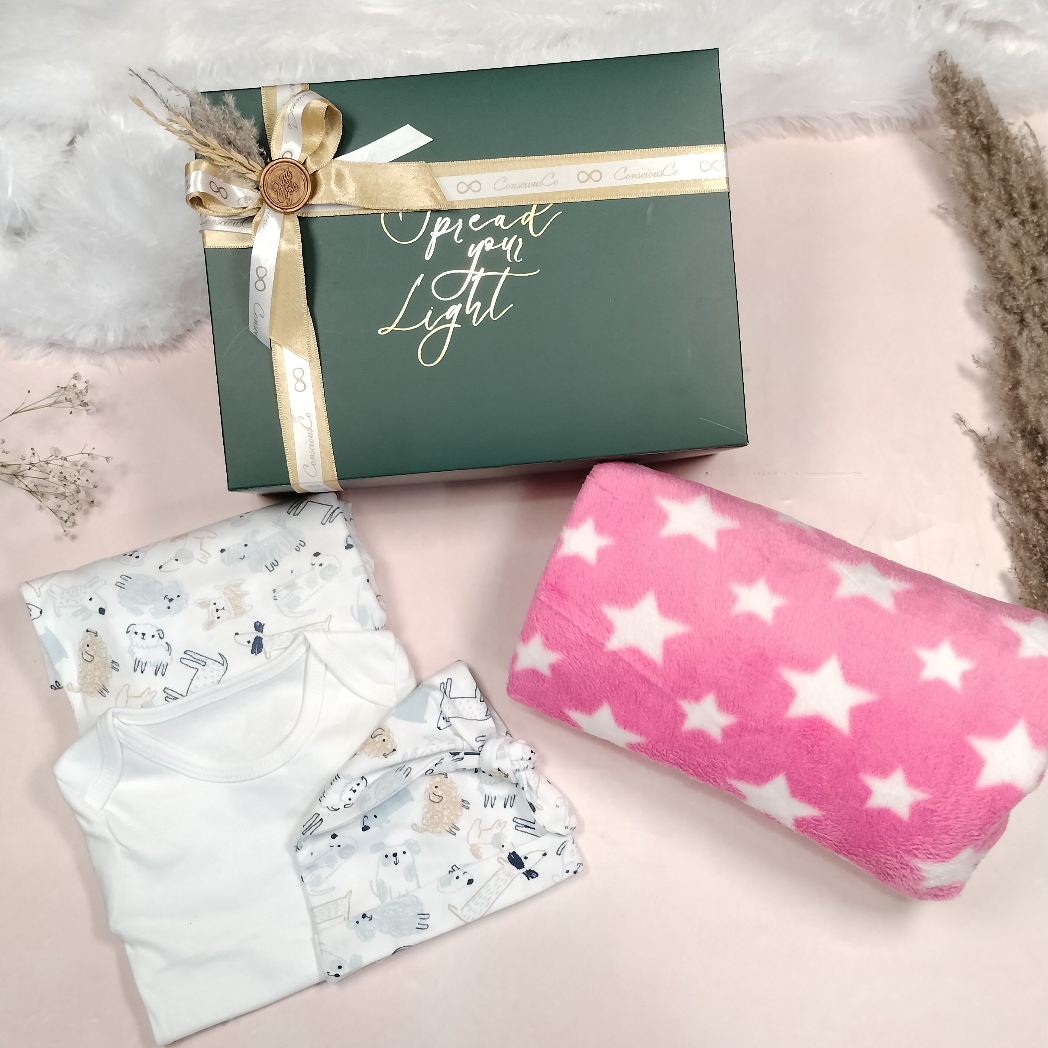 Introducing our "Cuddle Me Baby" hamper, thoughtfully curated for your precious newborn girl. This delightful hamper includes a charming baby clothing set featuring soft onesies and cute patterns, ensuring both comfort and style for your little one. Complementing the outfit is a dreamy star-patterned blanket, perfect for snuggles and creating a cozy atmosphere.