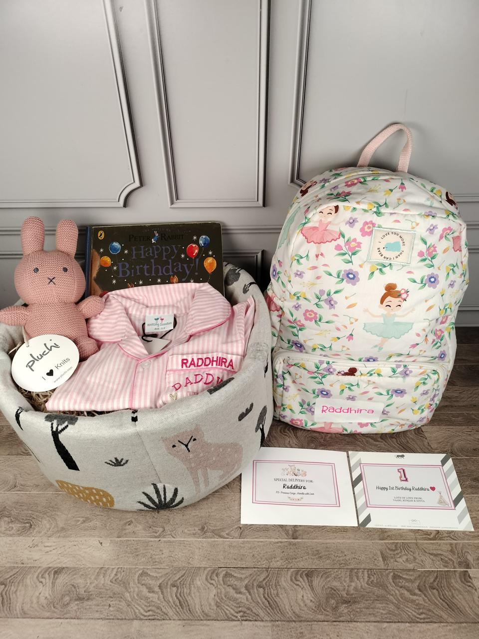 A Bundle of Joy for Their Big One!Celebrate the magical milestone of turning ONE with our thoughtfully curated First Birthday Hamper—a heartwarming collection of keepsakes and essentials, perfect for your little star's special day. This charming hamper includes:🎁 A cozy nightsuit for sweet dreams🎁 A personalised bag—just their size and name🎁 A delightful story book to spark early imagination🎁 A cute storage basket to keep their treasures organized🎁 A cuddly soft toy to become their first best friend Beautifully packed and filled with love, this hamper is perfect for creating memories, starting traditions, and gifting smiles. Because the first birthday deserves a little extra magic.