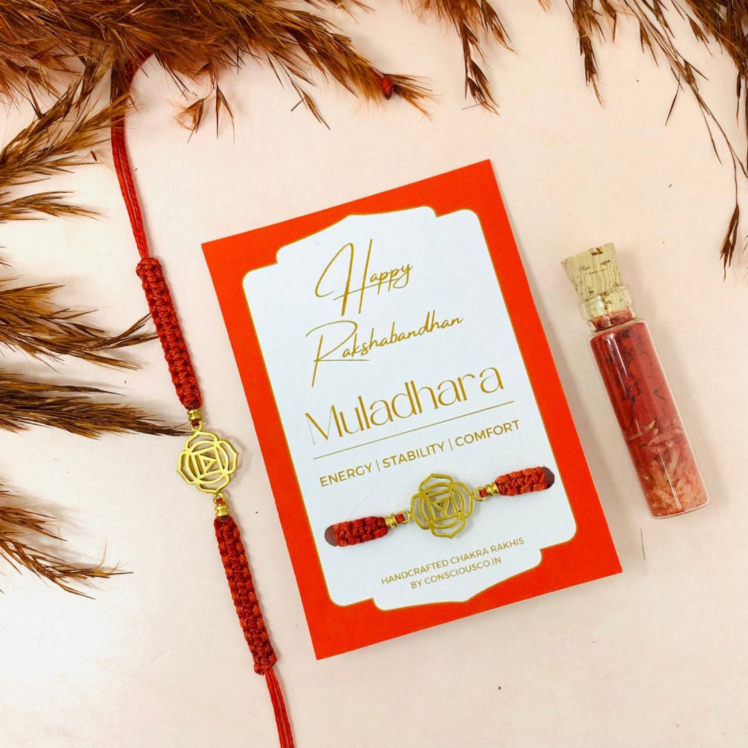 Send love to your brother with this premium MULDHARA Chakra Rakhi. When the Muladhara Chakra is balanced, a person experiences stability, confidence, energy, and strength. It governs our basic needs for good health in the body, a sense of connection to the Earth, and feeling supported and stable in the physical world. The Rakhi has been hand-braided by artisans in Goa. The centre motif is approx 20mm. Price is for a single rakhi only.
