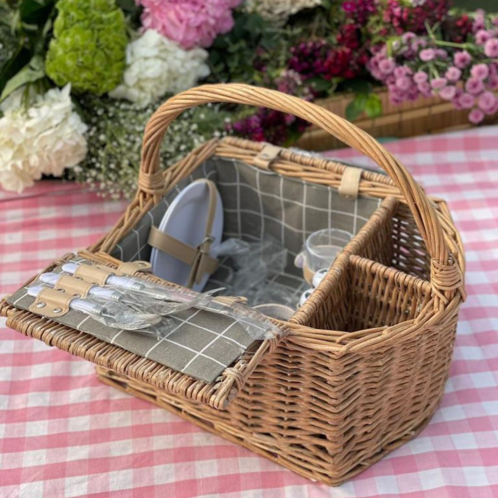 When it’s just you and your significant other, this picnic basket is just the right choice. This beautIful willow picnic basket is lined with grey colored fabric has two bottle holder compartments. Fill it with fruit, sandwiches, your favorite cheese, home-baked chocolate chip cookies, and a bottle of wine to have the perfect date night. This basket includes – • 1 fitted cooler bag • 2 white Melamine plates • 2 cups • 2 sets of knives forks and spoons with white handle • 1 opener with handle • 2 salt and pepper shaker