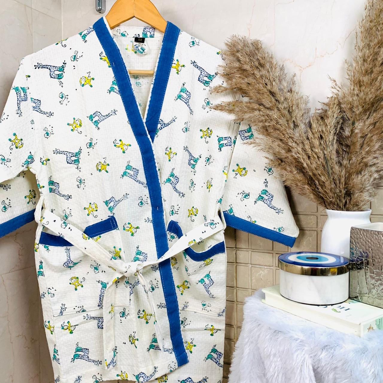 Here is a special bath robe for the kids, Super-soft, quick-dry & 100% waffle cotton. Our Bathrobes are made with love in India and use 100% AZO-free dyes. They are lightweight and make a great utility product for gifting as well as personal use. Bath robes are available in 3 sizes- S (2-4 years), M (5-8 years), L (9-12 years).
